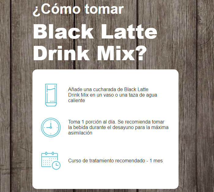 De acuerdo con las instrucciones proporcionadas en el sitio web oficial del producto, el uso de Black Latte Drink Mix es simple y no tomará más de 5 minutos. Remoje 2 cucharadas de Black Latte Drink Mix en agua hirviendo. Tomar 20 minutos antes de la comida principal. La duración recomendada del curso es de 30 días. La práctica ha demostrado que para perder peso sin riesgo para la salud, es suficiente beber solo una taza de Black Latte Drink Mix al día por la mañana. Aumenta la vitalidad – la bebida energiza y la vivacidad durante todo el día.