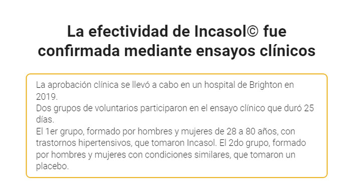 En 2016 se realizaron varios ensayos clínicos del fármaco en el Instituto de Enfermedades Cardiovasculares con la participación de 10.000 voluntarios. Para cada sujeto, la presión durante mucho tiempo se mantuvo en el nivel de 140/90 y superior. Como resultado de la aplicación mensual Incasol: