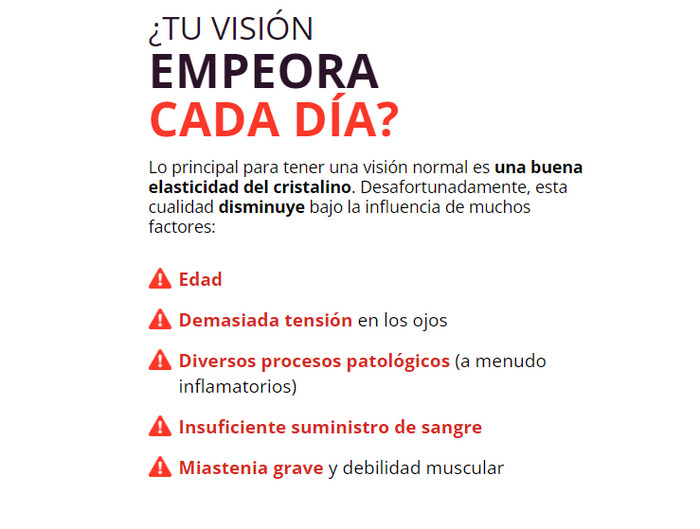 Esta herramienta restaura perfectamente la visión, alivia la fatiga, elimina el enrojecimiento y alivia otros problemas asociados con los ojos. El medicamento debe ser tomado por quienes estén preocupados por las siguientes patologías: