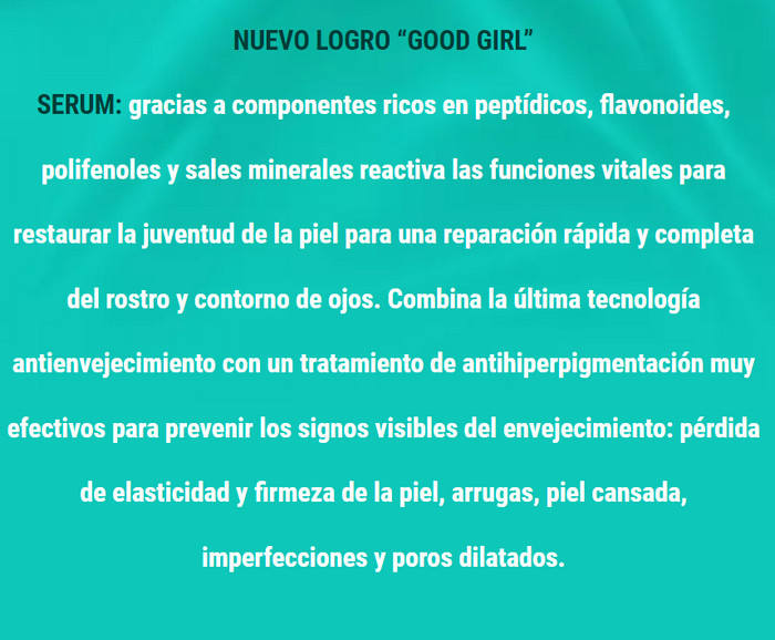 Además Good Girl combate eficazmente las manchas pigmentarias, aclarando delicadamente las zonas oscuras. Al mismo tiempo, calma, alivia las rojeces, la flacidez, la sequedad y la descamación. El efecto es similar al de las inyecciones de Botox.