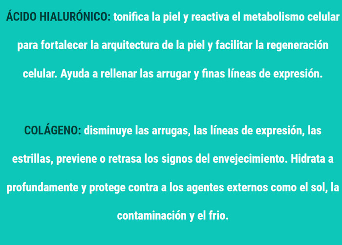 - Contribuye a reponer la deficiencia de ácido hialurónico y elimina la falta de hidratación a nivel celular, inicia procesos de regeneración.