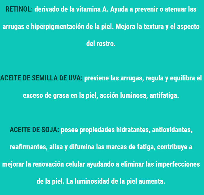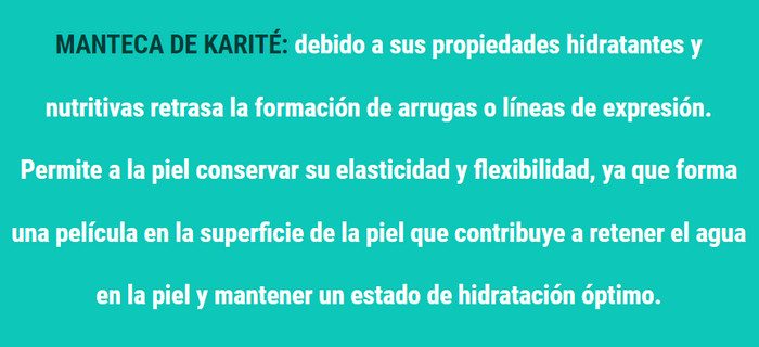 - Proporciona nutrición intensiva, hidratación, retención de humedad, protección contra los rayos uv y los radicales libres.
