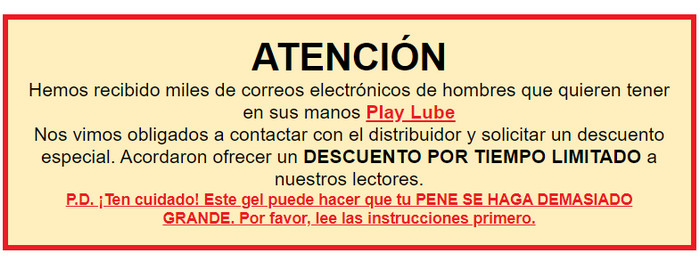 Play Lube ofrece una solución para los hombres que quieren recuperar su confianza en el sexo y mejorar radicalmente su potencia. El gel contiene ingredientes naturales que juntos proporcionan un agrandamiento seguro y eficaz del pene de 5 cm en un mes.