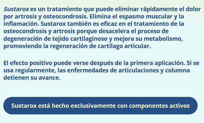 Para conseguir el efecto terapéutico deseado se debe utilizar el producto según las instrucciones de uso adjuntas Sustarox. El precio del producto lo hace accesible a todas las personas. Recuerde que el producto puede restaurar la funcionalidad del sistema musculoesquelético solo con un uso regular. Si se aplica una vez, sólo proporcionará un efecto temporal de alivio del dolor.
