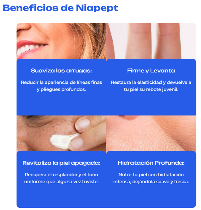 Niapept es ideal para su uso diario y se convertirá en un valioso aliado para mantener la salud y belleza de la piel. Este producto está diseñado para aquellos que desean mantener una apariencia juvenil, fresca y radiante durante muchos años.