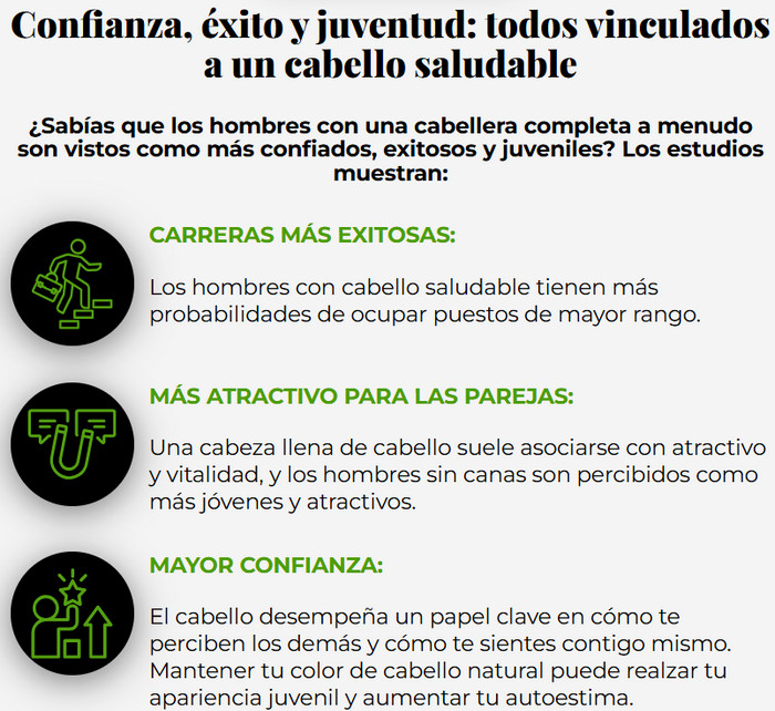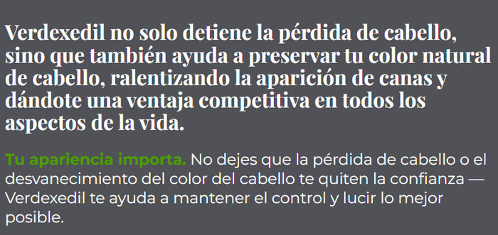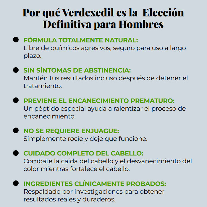 Además, los usuarios frecuentemente mencionan que Verdexedil puede ser útil en la lucha contra las canas prematuras. Muchos notan que el uso regular del producto ayuda a ralentizar la aparición de canas, preservando el color natural y la juventud del cabello.