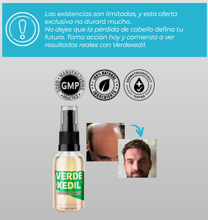 Verdexedil es un spray natural para el cabello diseñado para mejorar su salud. Puede contribuir a combatir problemas como la calvicie y las canas prematuras. Verdexedil contiene componentes naturales que pueden tener un efecto positivo en el estado del cabello y el cuero cabelludo.