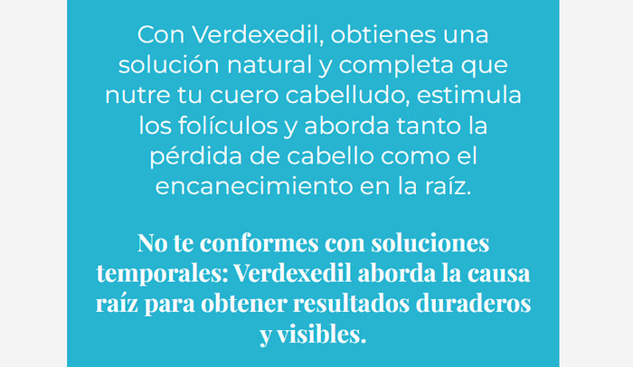 - Personas que experimentan caída del cabello: Si notas que tu cabello se cae con más frecuencia, Verdexedil puede fortalecer los folículos y reducir la pérdida de cabello